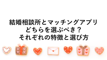 マッチングアプリ結婚相談所とマッチングアプリ、どちらを選ぶべき?それぞれの特徴と選び方 結婚相談所は真剣な婚活を希望する人向け、マッチングアプリは気軽に始められる方法として注目されています。それぞれの特徴、メリット・デメリットを理解し、目的や予算に合わせて選ぶことが大切です。 2024.12.28マッチングアプリ